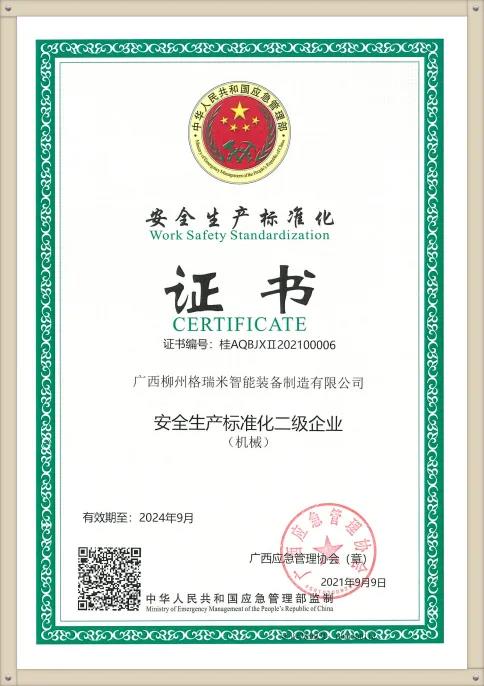 2021年10月27日,柳州格瑞米公司順利通過安全生產(chǎn)標(biāo)準(zhǔn)化評(píng)審,取得廣西應(yīng)急管理協(xié)會(huì)簽發(fā)的認(rèn)證證書,成為安全生產(chǎn)標(biāo)準(zhǔn)化二級(jí)企業(yè)(機(jī)械)。