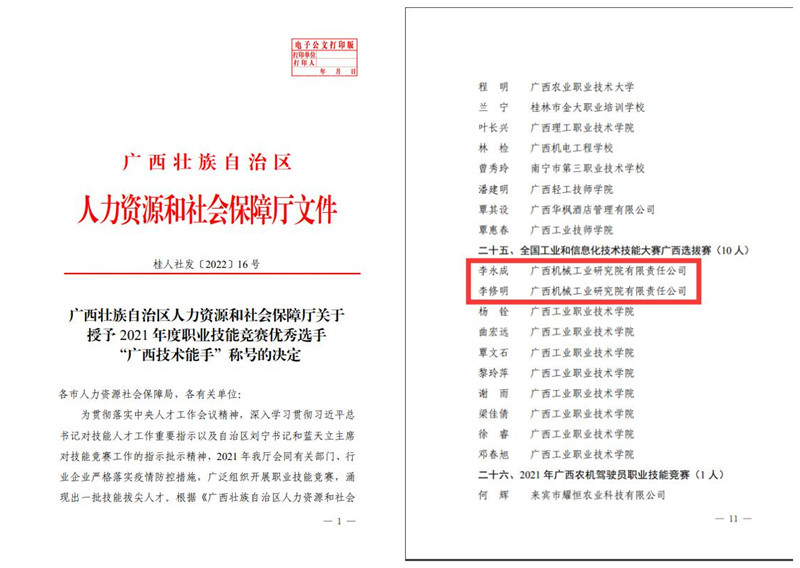 近日,廣西壯族自治區(qū)人力資源和社會(huì)保障廳印發(fā)了《關(guān)于授予2021年度職業(yè)技能競(jìng)賽優(yōu)秀選手“廣西技術(shù)能手”稱號(hào)的決定》,向在2021年度自治區(qū)級(jí)職業(yè)技能競(jìng)賽中取得優(yōu)異成績(jī)的選手授予“廣西技術(shù)能手”稱號(hào)。機(jī)械院李永成、李修明2名同志憑借在2021年度自治區(qū)級(jí)職業(yè)技能競(jìng)賽中的突出表現(xiàn),在此次表彰中獲此殊榮。