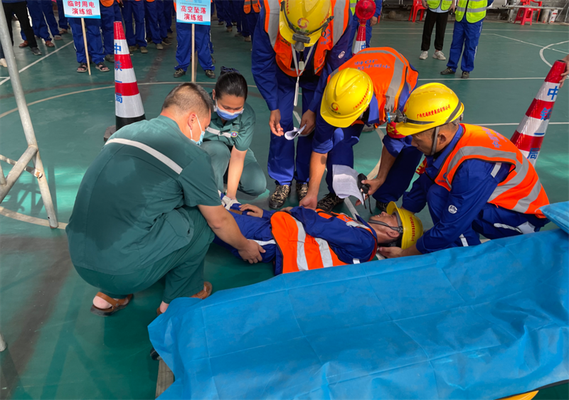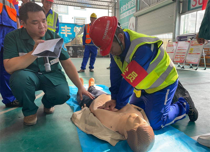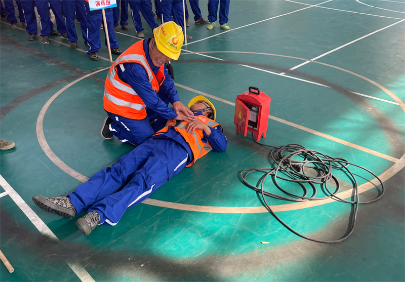 活動現(xiàn)場,項目部安全總監(jiān)對綜合應急救援演練方案進行了詳細的講解。參訓人員分組對施工中常見的觸電、高處墜落應急救援、觸電事故應急救援、各類消防器材的使用進行了演練。醫(yī)護人員現(xiàn)場示范了中暑急救、胸外擠壓急救措施、人工呼吸方法、骨傷綁扎固定等應急救援措施。通過形象生動地講解示范和實踐演練讓參訓人員深刻理解應急救援知識,掌握急救措施,提升事故防范處理能力,有效防范安全事故發(fā)生。
