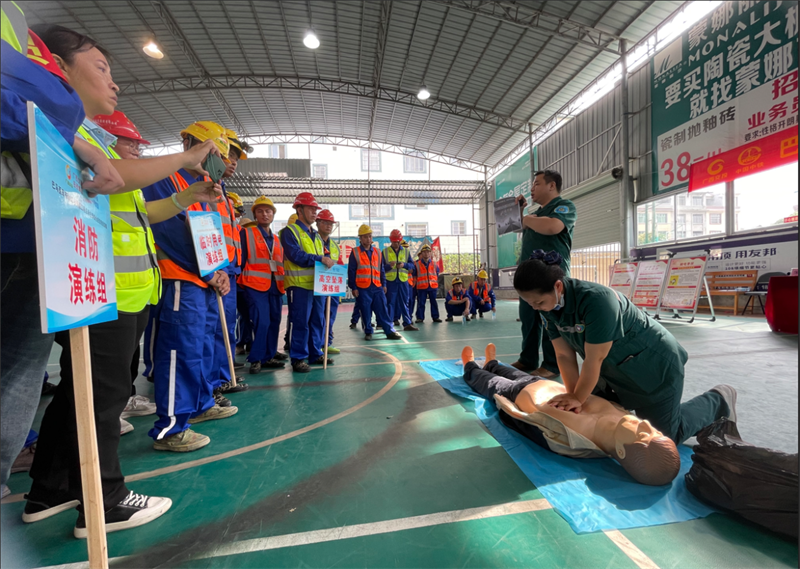 醫(yī)護人員現(xiàn)場示范中暑急救、胸外擠壓急救措施、人工呼吸方法、骨傷綁扎固定等應急救援措施
