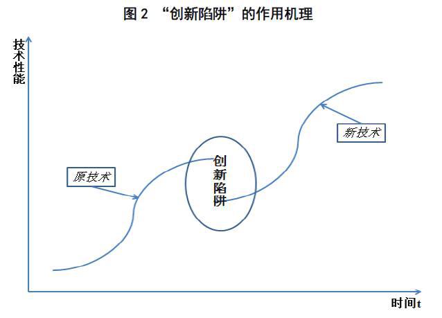 “創(chuàng)新陷阱”正是產(chǎn)生于這種新舊技術(shù)的更替過程中(參見圖2)。具體來說,對(duì)于一家企業(yè),從原有技術(shù)軌道跨向新技術(shù)軌道是一件不容易的事情;企業(yè)越是在自己原有的技術(shù)專長(zhǎng)上加以創(chuàng)新,便會(huì)在原有技術(shù)軌道上走得越遠(yuǎn);也正因?yàn)槿绱?,企業(yè)也便越會(huì)延滯進(jìn)入新的技術(shù)軌道,進(jìn)而也越來越遭受舊技術(shù)極限的扼制。
