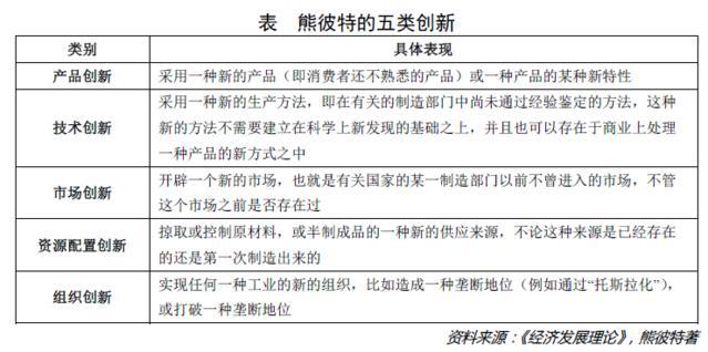 在熊彼特看來,創(chuàng)新包括五種情況,分別為產(chǎn)品創(chuàng)新、技術(shù)創(chuàng)新、市場(chǎng)創(chuàng)新、資源配置創(chuàng)新與組織創(chuàng)新,具體如下表: