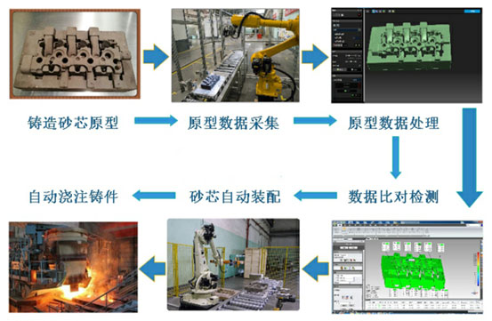 產(chǎn)品質(zhì)量檢測是企業(yè)生產(chǎn)現(xiàn)場在線工作模式,是一個生產(chǎn)線的工位,對測量設(shè)備精度和功能的要求遠(yuǎn)超過反求設(shè)計。因此,該檢測系統(tǒng)可無縫應(yīng)用于產(chǎn)品質(zhì)量在線檢測,如鑄造、鍛壓及注塑等生產(chǎn)線上的鑄件、鍛件、沖壓件、注塑件等復(fù)雜曲面產(chǎn)品檢測,“一鍵式”全自動完成掃描檢測流程,保證最佳的測量精度和速度,實現(xiàn)質(zhì)量控制(QC)與部件生產(chǎn)環(huán)節(jié)緊密結(jié)合。主要技術(shù)包括: