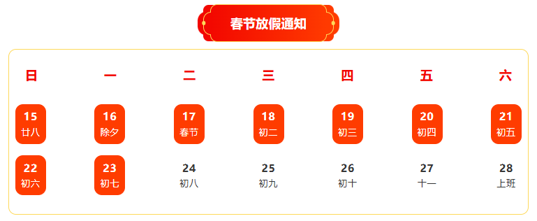 新春將至,萬象更新。感謝大家在過去一年中的支持、信任與并肩同行!根據(jù)國家春節(jié)放假安排,結(jié)合我司實際情況,現(xiàn)將2026年春節(jié)假期安排通知如下: